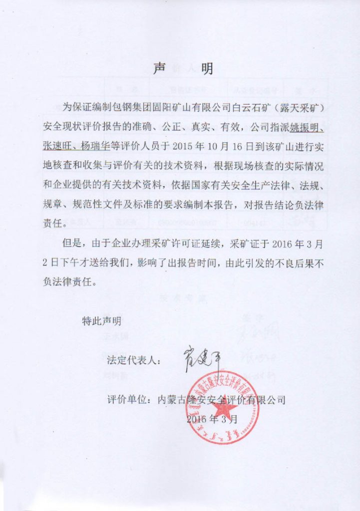 包鋼集團(tuán)固陽礦山有限公司白云石礦安全現(xiàn)狀評價(jià)報(bào)告–簽字表