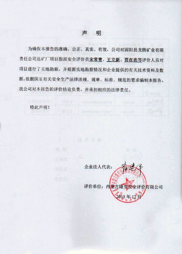 固陽(yáng)縣龍騰礦業(yè)有限責(zé)任公司選礦廠項(xiàng)目安全現(xiàn)狀評(píng)價(jià)報(bào)告–簽字表