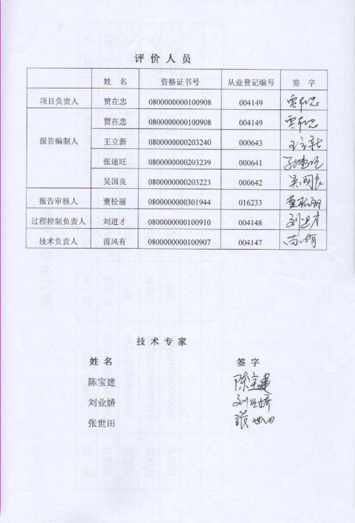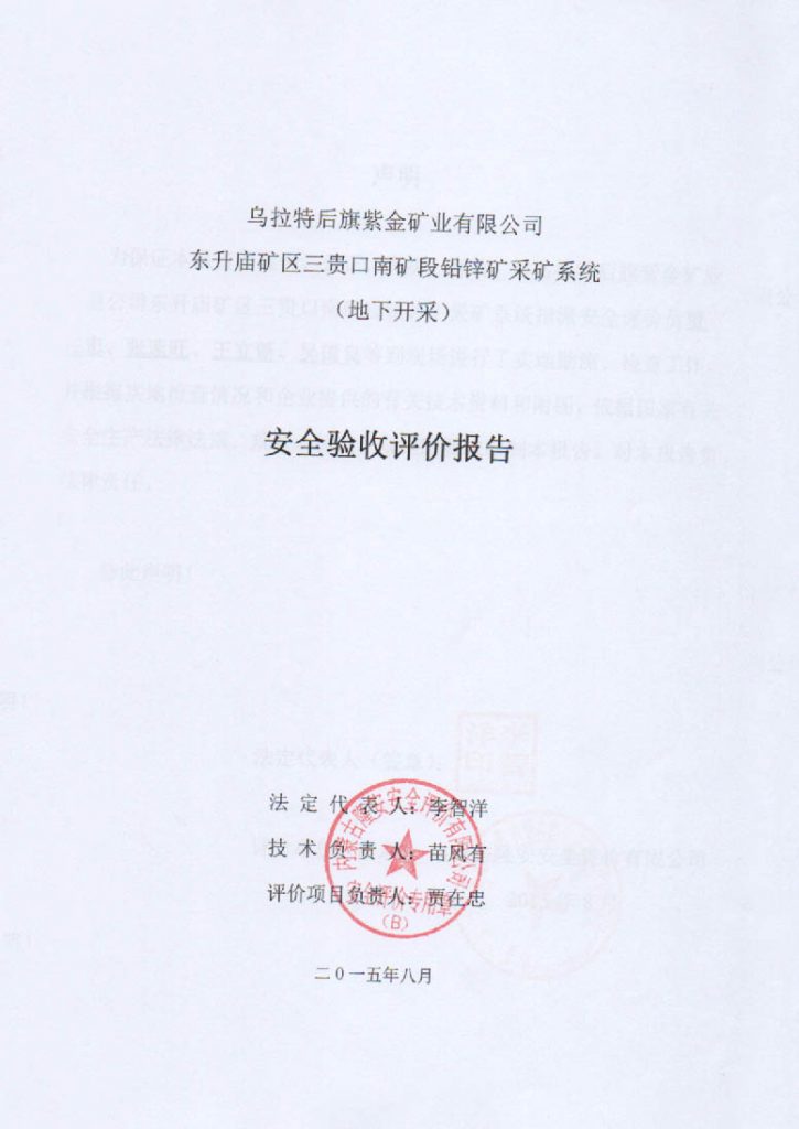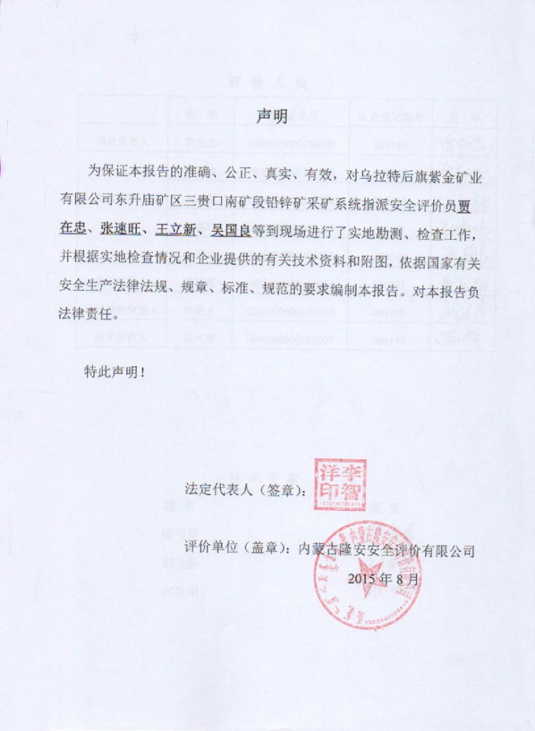 烏拉特后旗紫金礦業(yè)有限公司東升廟礦區(qū)三貴口南礦段鉛鋅礦采礦工程安全驗收評價報告–簽字表
