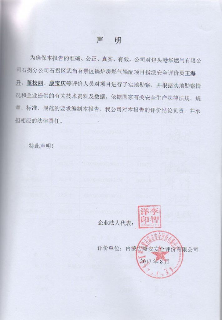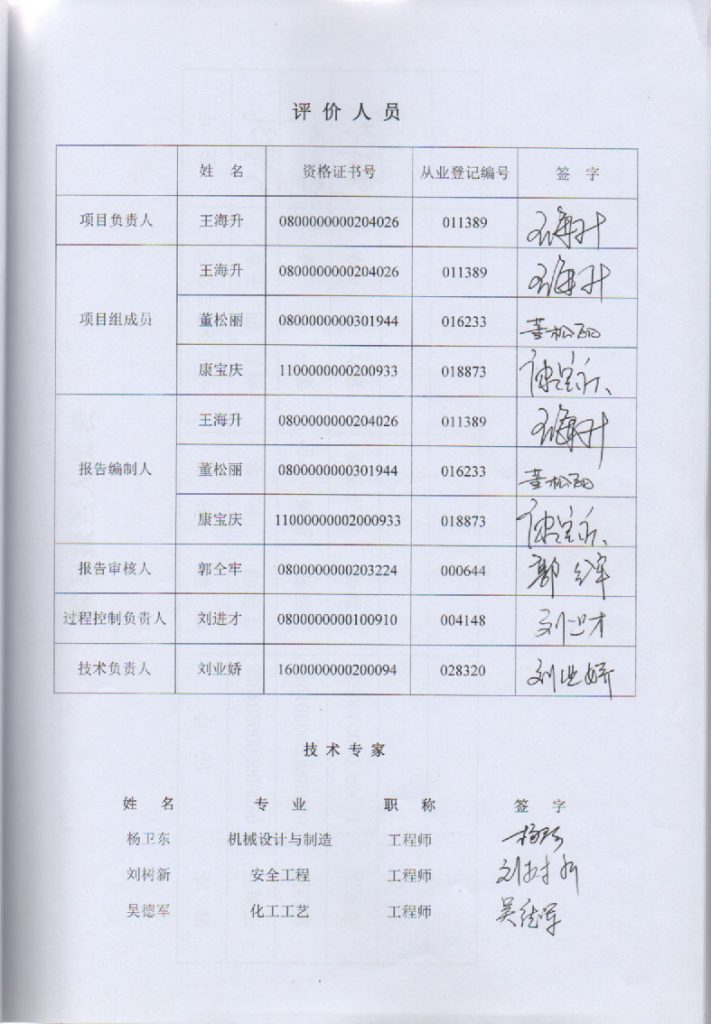 包頭港華燃?xì)庥邢薰臼辗止臼瘴瀹?dāng)召景區(qū)鍋爐房燃?xì)廨斉漤?xiàng)目安全現(xiàn)狀評價(jià)報(bào)告–簽字表