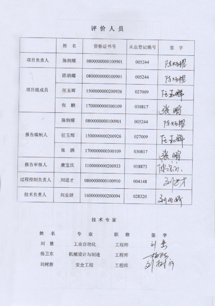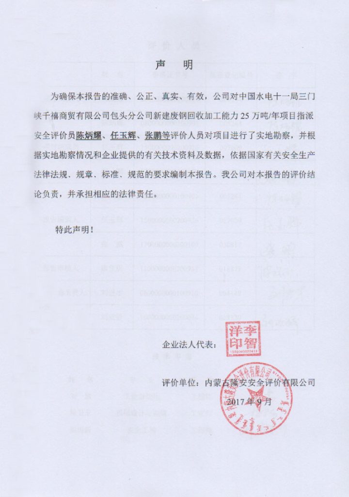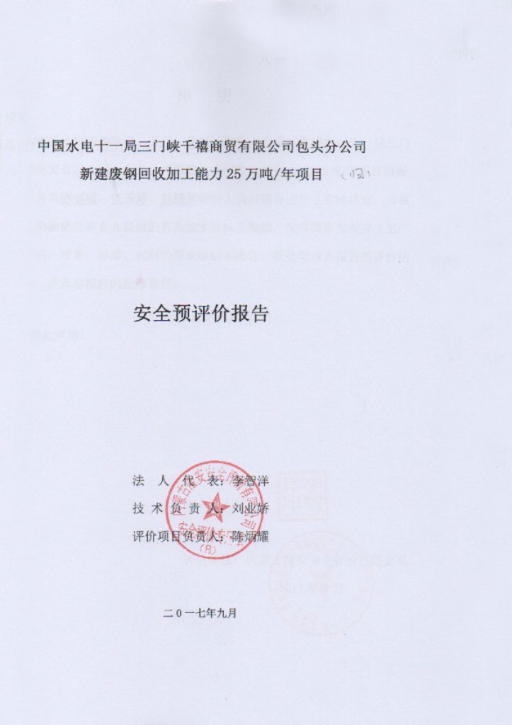 中國(guó)水電十一局三門峽千禧商貿(mào)有限公司包頭分公司新建廢鋼回收加工能力25萬(wàn)噸/年項(xiàng)目安全預(yù)評(píng)價(jià)報(bào)告–簽字表
