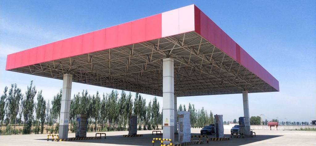 加油站建有175m2的站房一座,469m2的罩棚一座,罩棚網(wǎng)架下旋高度8m。