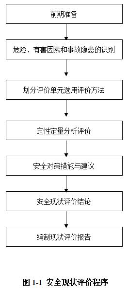 按照國(guó)家安全生產(chǎn)監(jiān)督管理局按照《安全評(píng)價(jià)通則》(AQ 8001-2007),本安全現(xiàn)狀評(píng)價(jià)程序?yàn)椋呵捌跍?zhǔn)備;危險(xiǎn)、有害因素和事故隱患識(shí)別;定性、定量評(píng)價(jià);安全管理現(xiàn)狀評(píng)價(jià);確定安全對(duì)策措施及建議;確定評(píng)價(jià)結(jié)論;安全現(xiàn)狀評(píng)價(jià)報(bào)告完成。