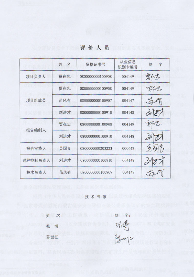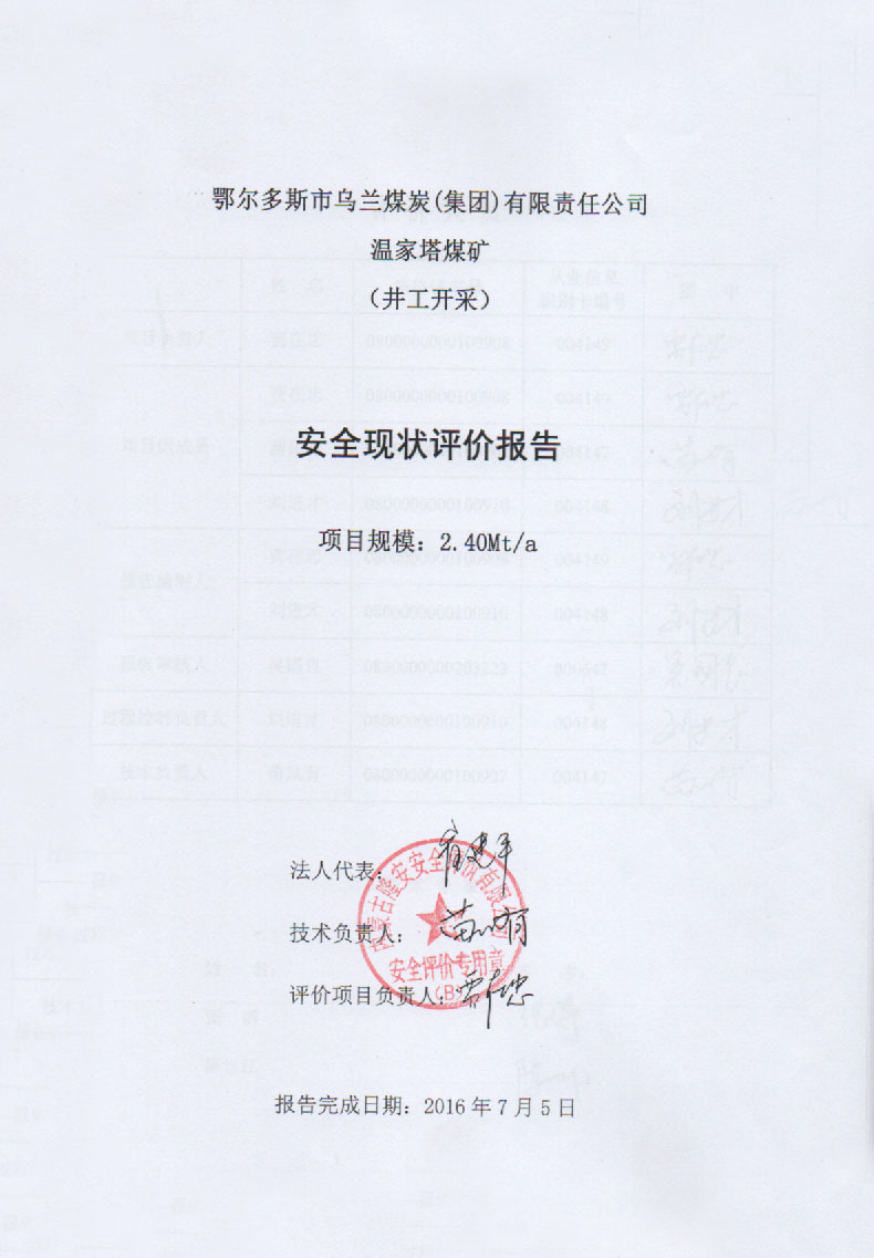 鄂爾多斯市烏蘭煤炭(集團)有限責任公司溫家塔煤礦(2.40Mta)安全現(xiàn)狀評價報告–簽字表